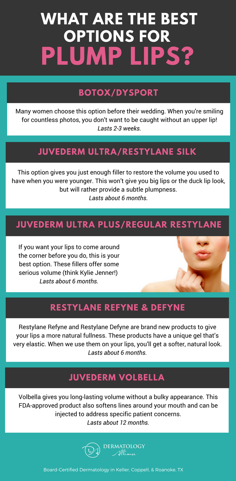 If you want your lips to come around the corner before you do, this is your best option. These fillers offer some serious volume (think Kylie Jenner!) to your lips. Juvederm Ultra Plus or Regular Restylane also last about 6 months, depending on mouth movement.